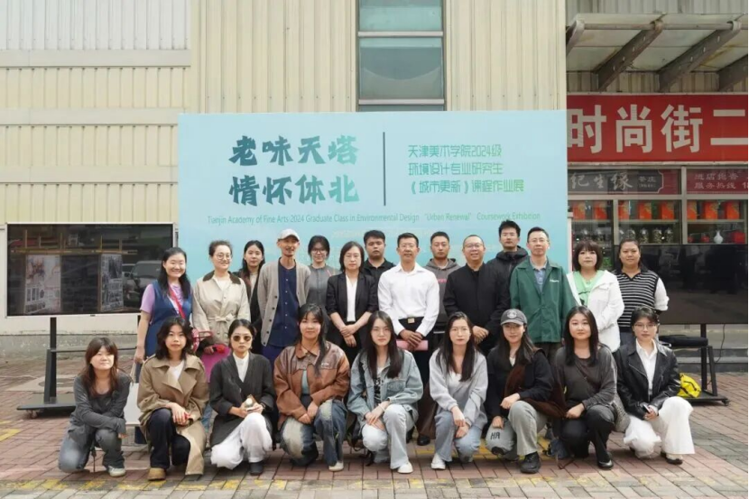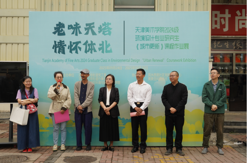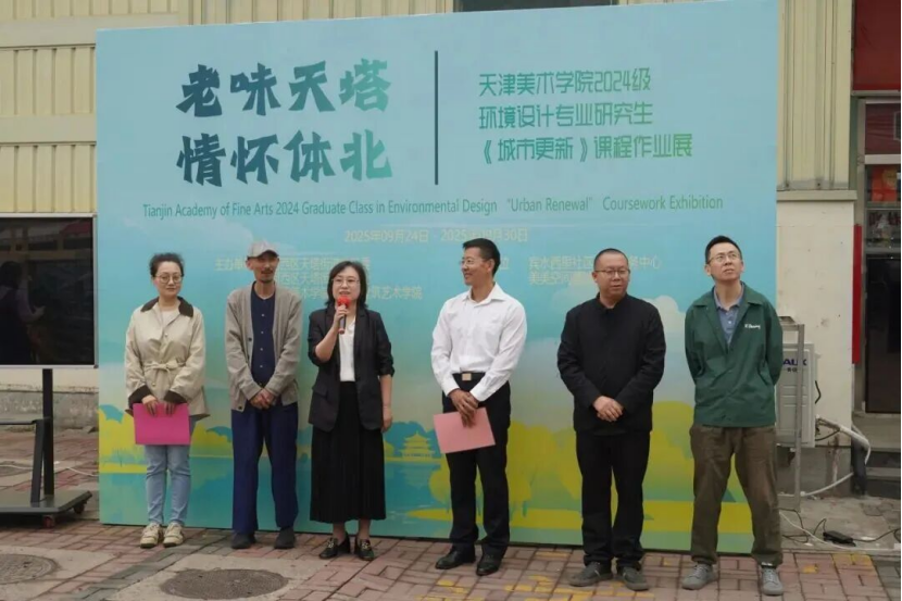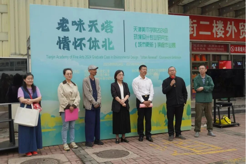 天津美术学院2024级环境设计研《城市更新》课程作业展在河西区天塔街道体北菜市场开幕,由学院与天塔街道联合主办。展览展出 4 组设计、4 组动画及百余幅照片,以社区“微更新”回应街道生活。天塔街道孙洪吉、学院刘峥等致辞,强调校社合作重要性。活动既是成果展示,也是三方联动的社区更新实践。