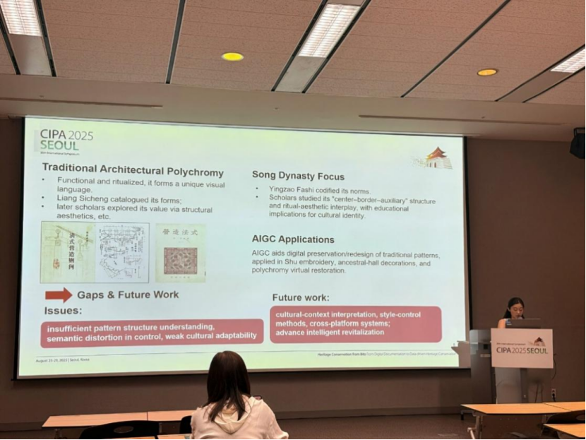 2025年8月25日-29日,第30届国际文化遗产记录委员会(CIPA 2025)双年会在韩国首尔举办,会议以 “从数字记录到数据驱动的文化遗产保护” 为主题,47国500余名专家参会。我院刘静老师带本科生团队参会,相关AIGC古建筑彩画论文入选ISPRS Annals并作报告,研究验证AIGC赋能传统彩画再生可行性。此次参会助力人才培养,提升学院国际影响力,未来将推动更多成果走向国际。