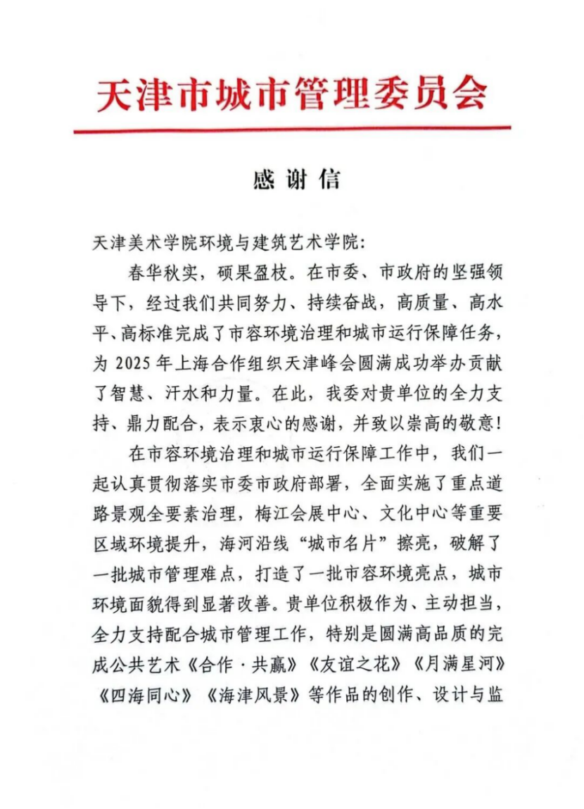 天津上合峰会成功举办,标志天津开放发展里程碑,检验其统筹人才与环境实力。天津美术学院景育民教授团队,在竞争中获峰会全部五项公共艺术项目任务。景育民曾完成全运会主火炬塔等重大项目,此次成果获央视等权威报道,为城市注文化魅力、展天津形象,也为天美赢得崇高社会荣誉。