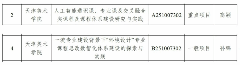 科研建设捷报频传,学科发展再添动力。环境设计系高颖教授主持的《人工智能通识课、专业课及交叉融合类课程及课程体系建设研究与实践》成功获批天津市教学质量与教学改革研究计划重点项目;环境设计系主任孙锦副教授申报的《一流专业建设背景下“环境设计”专业课程思政数智化体系建设的探索与实践》获批市级教改一般项目。两项市级教学改革项目同步立项,为学院专业建设、课程创新与教学改革注入强劲动能。