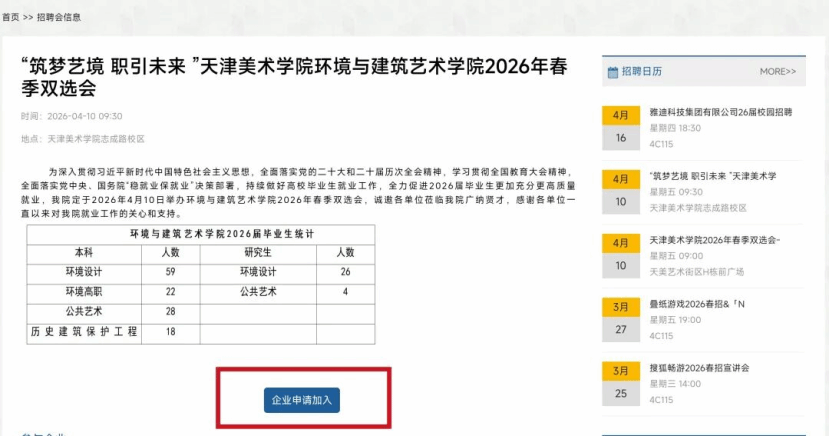 为深入贯彻习近平新时代中国特色社会主义思想,全面落实党的二十大和二十届历次全会精神,学习贯彻全国教育大会精神,全面落实党中央、国务院“稳就业保就业”决策部署,持续做好高校毕业生就业工作,全力促进2026届毕业生更加充分更高质量就业,我院定于2026年4月10日举办环境与建筑艺术学院 2026年春季双选会,诚邀各单位莅临我院广纳贤才,感谢各单位一直以来对我院就业工作的关心和支持。
