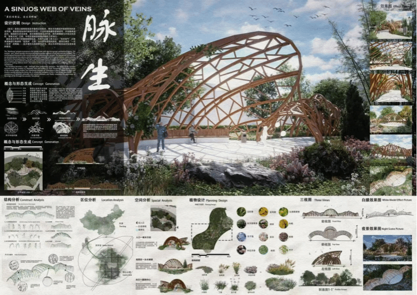 项目简介:《脉生》廊架的设计理念,是将植物的微观美学巧妙地融入到空间秩序的构建之中,通过榫卯结构的木构方式,模拟出叶脉中维管束的黄金比例网络。这一设计灵感,源自于古代工艺经典《考工记》中所提到的“天时地气”的智慧,同时也受到了陶渊明“返自然”思想的启发。当阳光与阴影在廊架的密肋之间游走,仿佛照见了“一花一世界”的隐喻,实现了技术理性与自然野性的和谐共生。 这种设计不仅展现了廊架的功能性,更赋予了其深厚的文化内涵和艺术价值,使得《脉生》廊架成为了一个充满生命力和诗意的空间艺术作品。