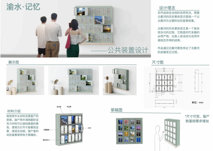 项目简介:《渝水记忆—北戴河北纬39°时空画卷》是一座立体动态窗景装置,以3米×3米的垂直空间为载体,通过机械传动与数字影像,呈现北戴河百年变迁。装置由九扇“时光之窗”构成,窗面采用渐变透明度亚克力板,观众推开窗格即可唤醒屏中历史影像,从1898年铁路穿行芦苇荡,到2015年沙丘与美术馆对话,展现自然与人文的交织。夜晚,装置切换为星月模式,Al复原的晚清星图随光影流淌。作品以窗为隐喻,寓意北戴河从渔村到开放之地的历程,引导观者思考历史与当下的对话。