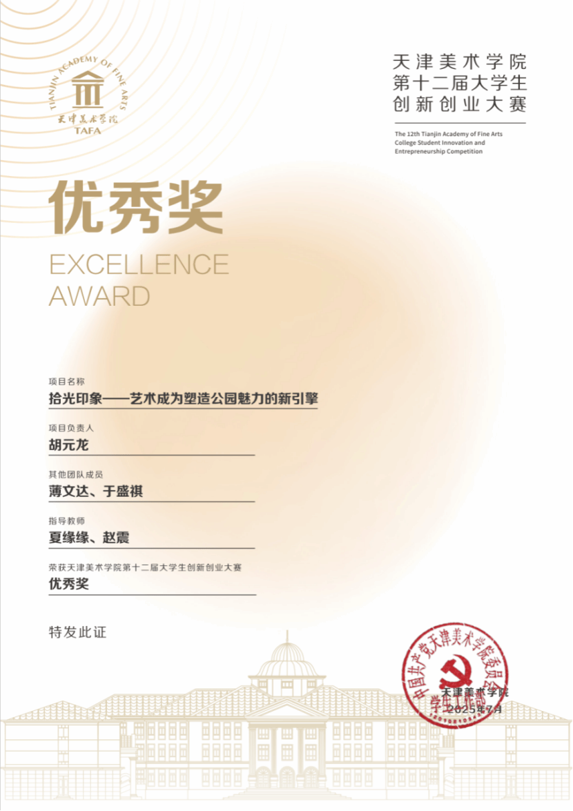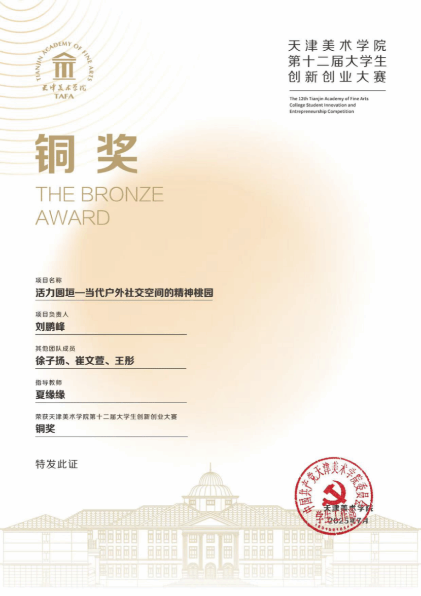 我院公共艺术专业刘鹏峰团队“活力圆垣——当代社交户外空间的精神桃园”、胡元龙团队“拾光印象——艺术成为塑造公园魅力的新引擎”获主赛道铜奖。指导教师夏缘缘博士在备赛时建立“课程 - 赛事 - 实践”联动机制,提升人才培养质量,助力学生成长成才。