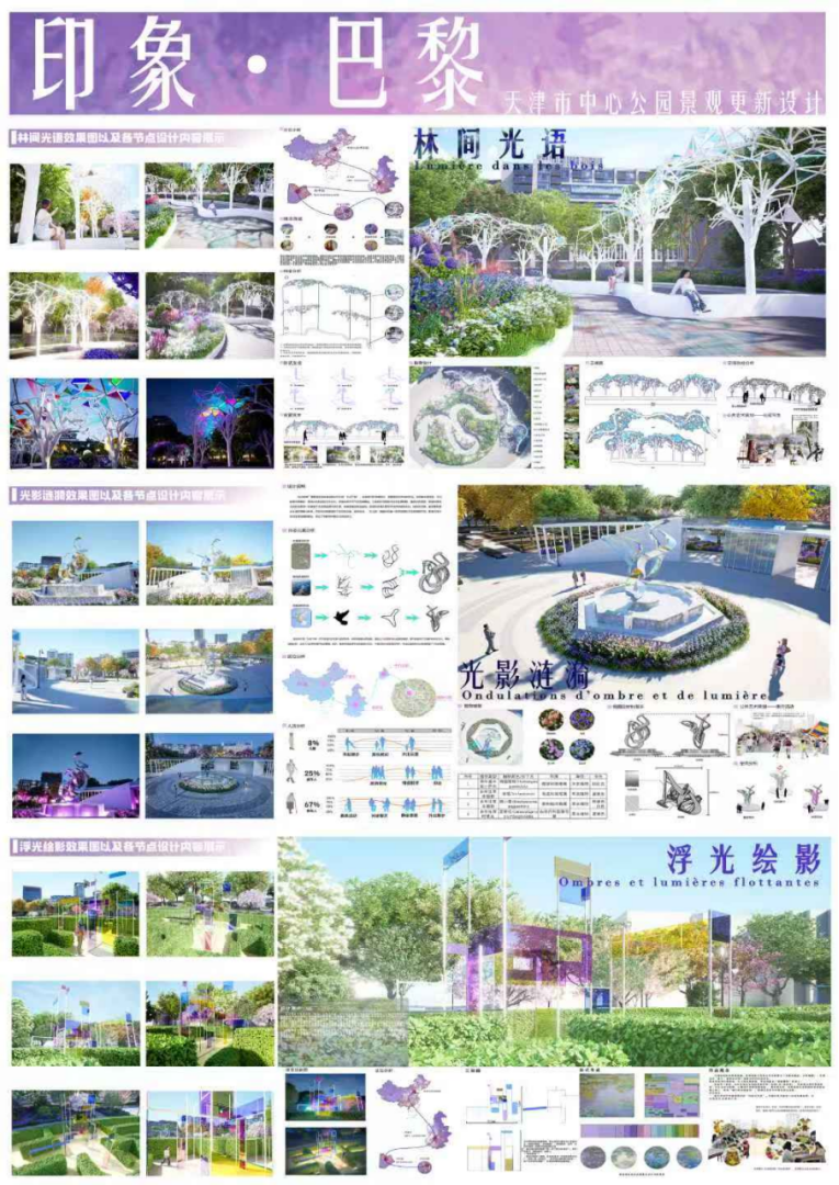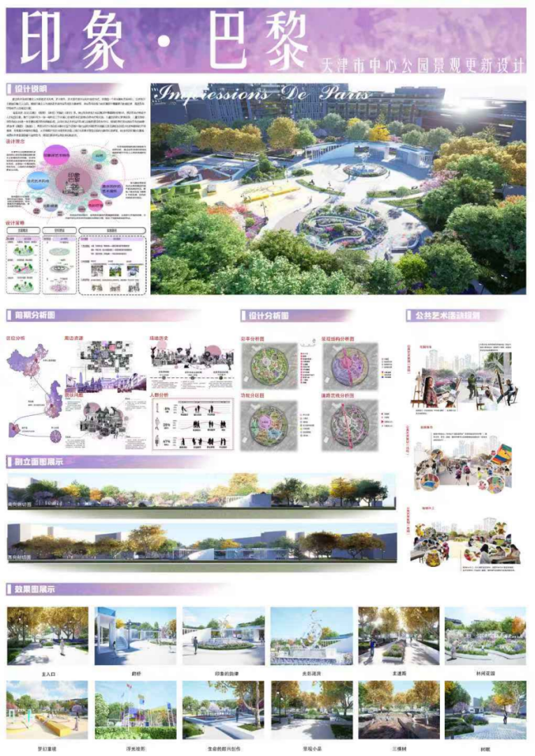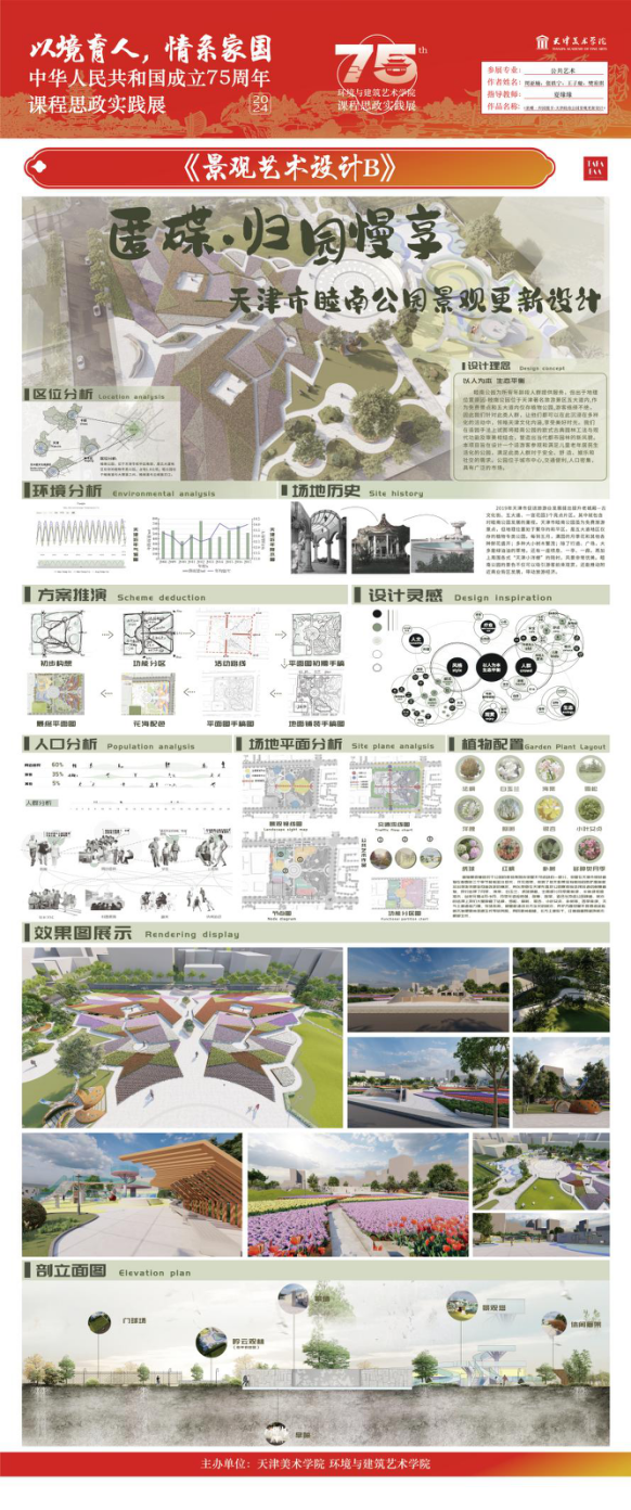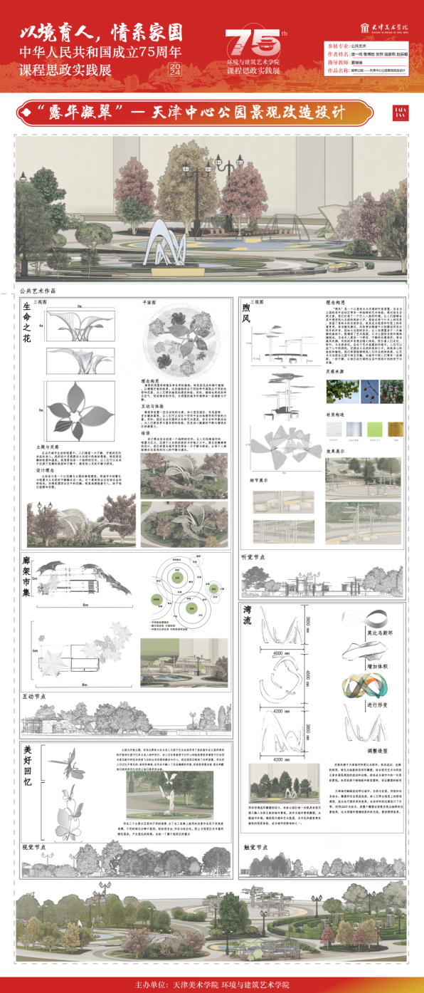2023级于盛祺、薄文达、胡元龙团队的《印象巴黎——天津中心公园景观更新设计》以“露天美术馆”为灵感源泉,荣获了第十五届中国好创意设计大赛全国二等奖。这些奖项充分证明了课程教学与思政育人相结合的成功。