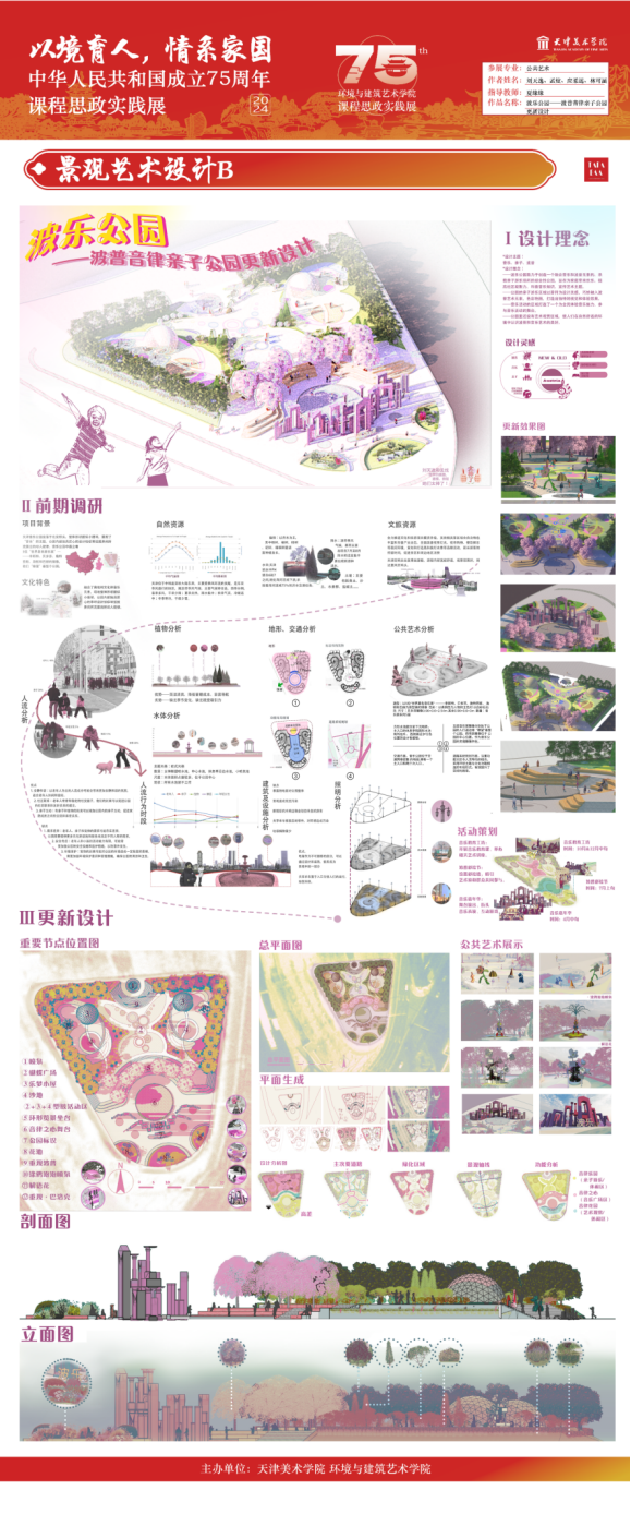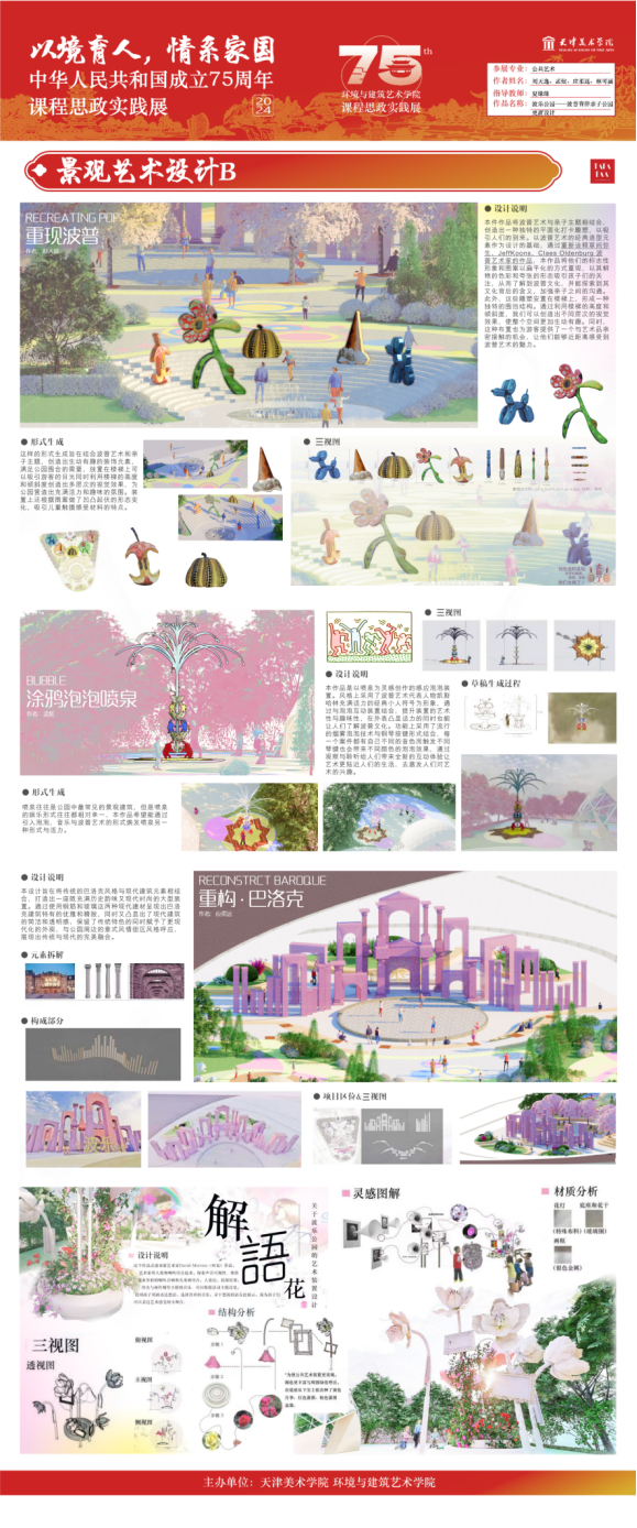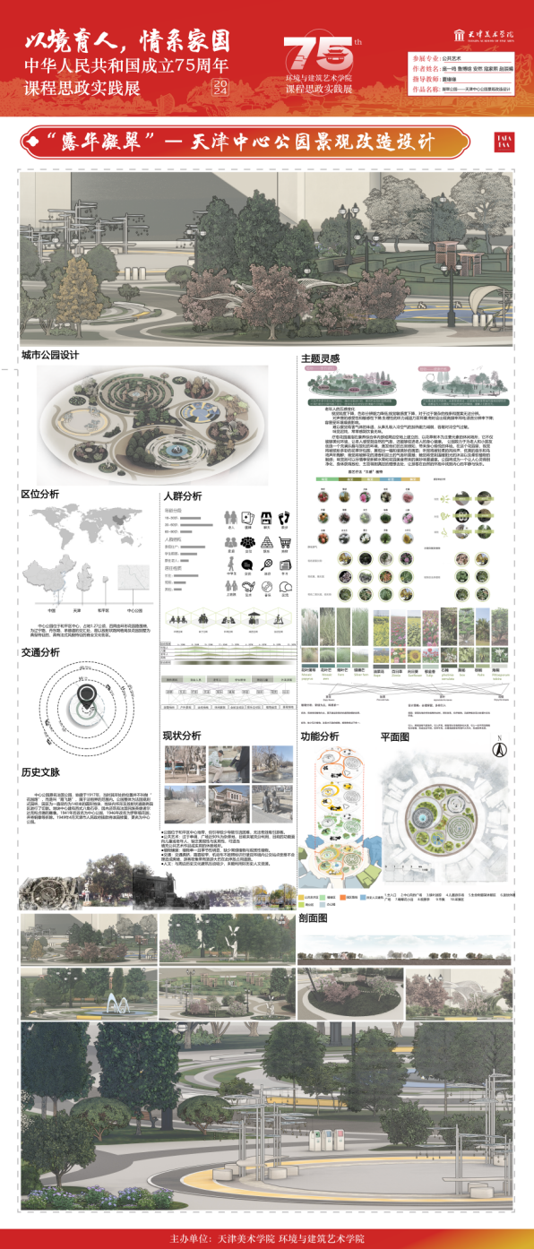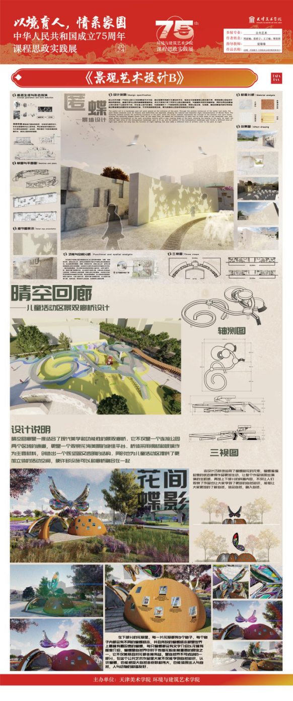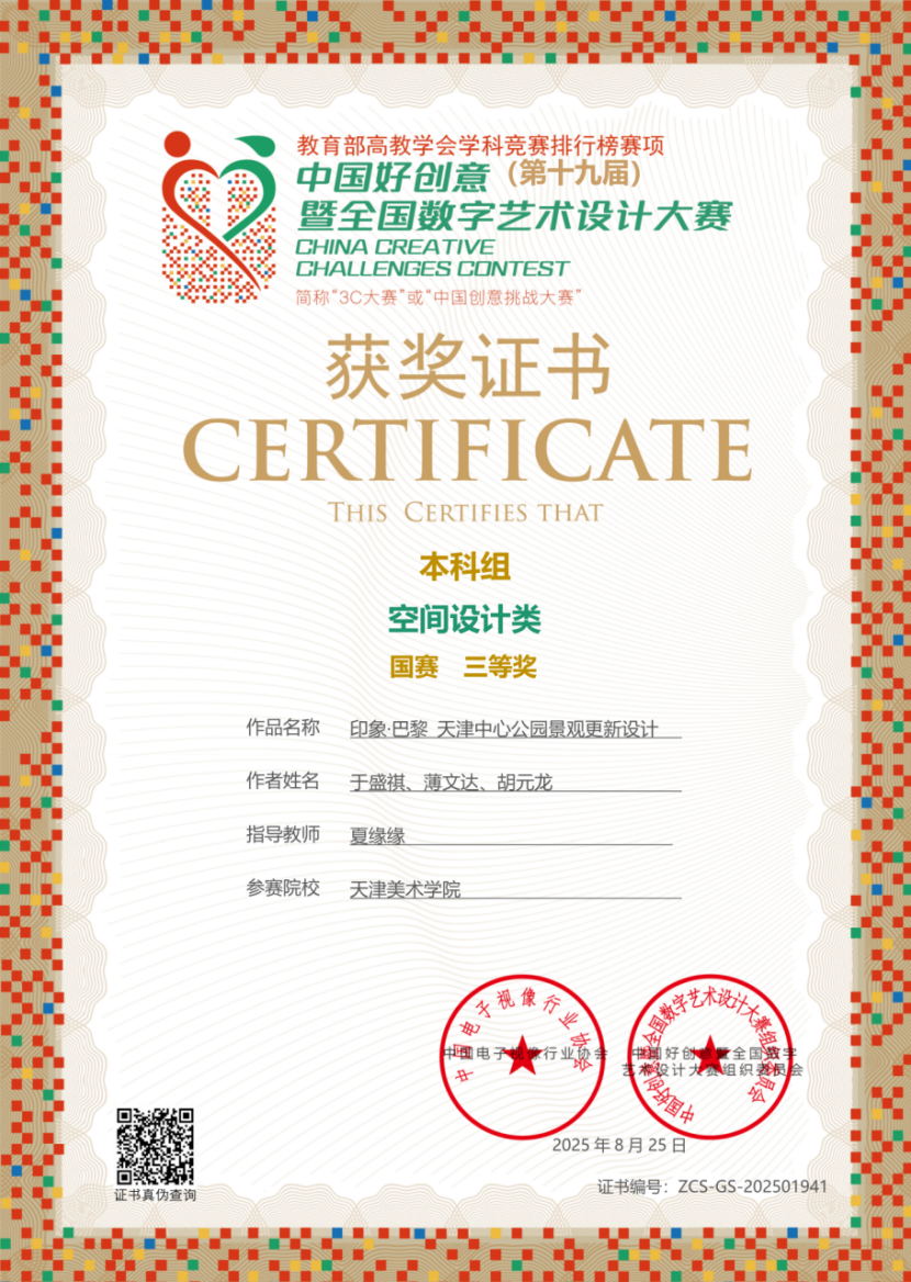 2023级于盛祺、薄文达、胡元龙团队的《印象巴黎——天津中心公园景观更新设计》以“露天美术馆”为灵感源泉,荣获了第十五届中国好创意设计大赛全国二等奖。这些奖项充分证明了课程教学与思政育人相结合的成功。