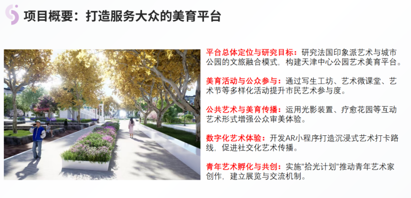 胡元龙团队的《艺术成为塑造公园魅力的新引擎》的项目将法国印象派艺术融入城市公园设计,打造具有文旅吸引力的艺术空间。重点推动促进天津美育传播,构建艺术创作推广平台,探索艺术创作与公共空间的结合模式。该项目荣获2025年中国国际“互联网+”大学生创新创业大赛天津赛区铜奖。