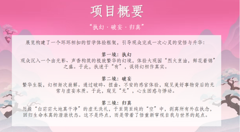 2024级张沛宁、王雅琦团队的天津历史文化街区活化与再利用大学生创新训练计划项目《梦回红楼·境游黄叶》,旨在突破传统白盒子美术馆的空间限制,把中国古典文学名著《红楼梦》的美学意境与哲学思考,通过十余组大型光影互动装置,打造成古典文学意象转化为可感、可触、可参与的震撼艺术现场。