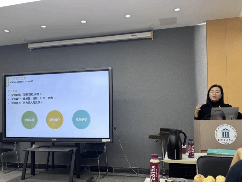 刘洁老师则从交互设计角度出发,讲解了如何利用NFC卡片实现公共艺术作品的互动体验。她结合具体案例,展示了观众“触碰即触发”的创作逻辑,拓展了学生对“媒介”与“公共性”的理解。