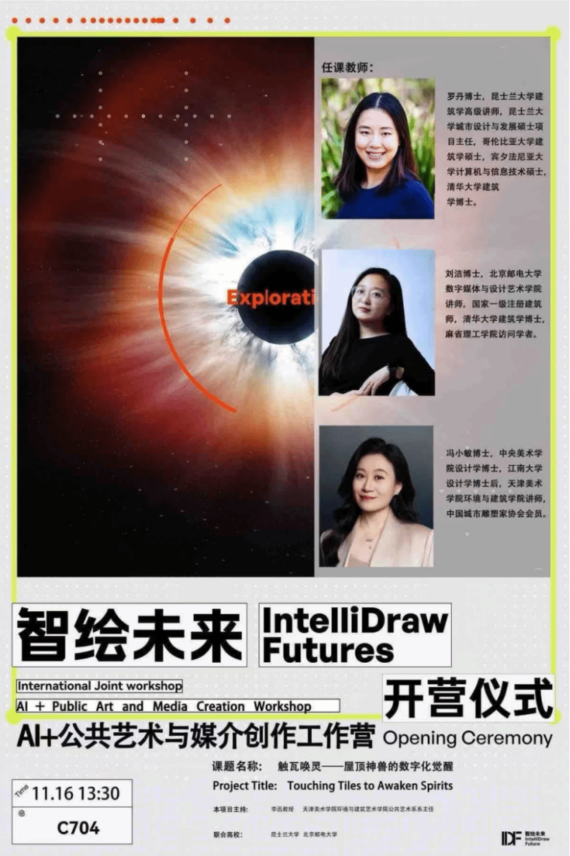 本营由澳大利亚昆士兰大学罗丹教授 、北京邮电大学刘洁老师 以及天津美术学院公共艺术系主任李迅教授和冯小敏老师联合指导。以 “触瓦唤灵——屋顶神兽的数字化觉醒” 为主题,融合AIGC、交互设计与公共艺术,开启一段传统与现代的对话之旅。