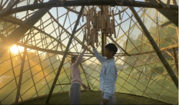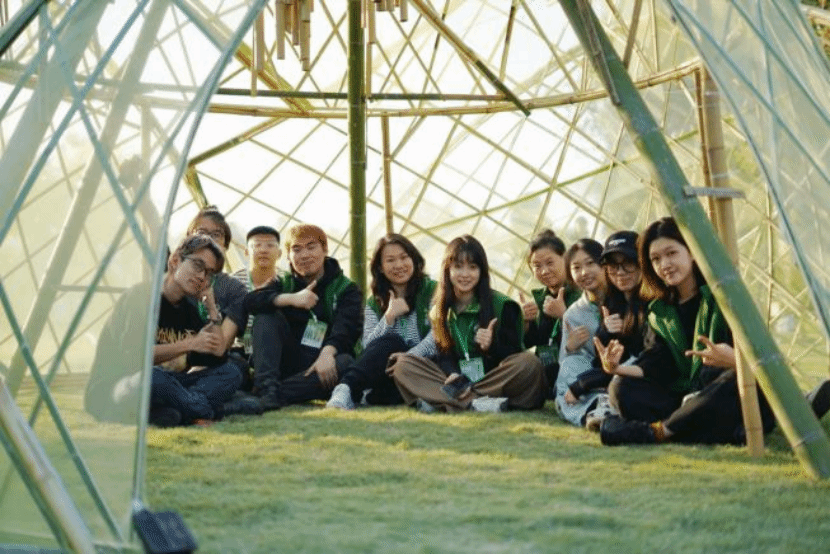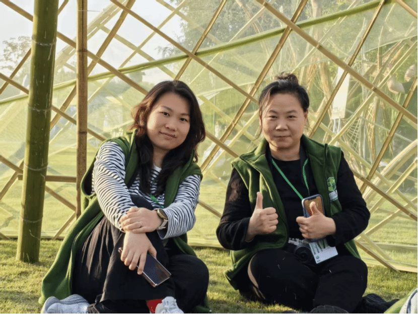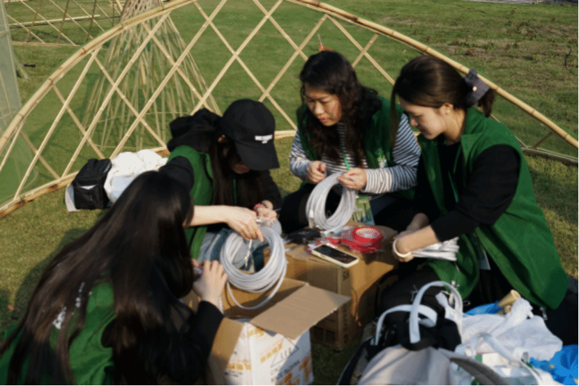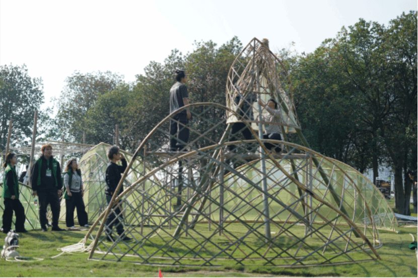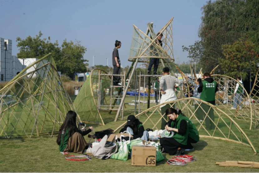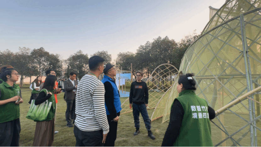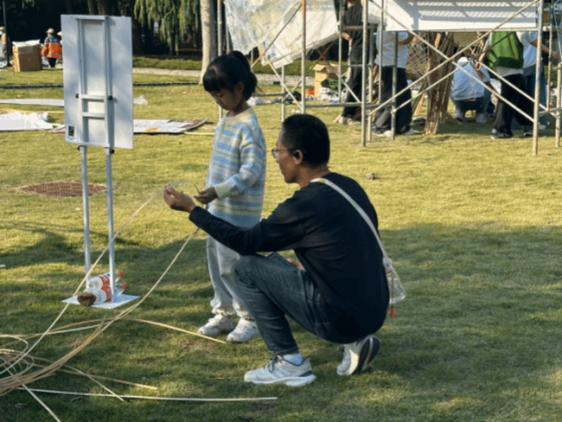 作品还成为了小朋友们的“互动乐园”,不少小朋友在老师和家长的陪伴下,围绕装置观察、触摸,有的还学着装置的结构用手边的小树枝进行简单搭建。团队成员张则逸主动为小朋友们讲解作品的设计理念,手把手教他们认识竹材的特性,现场充满了欢声笑语。这种与小朋友的温馨互动,不仅让艺术走进了大众生活,更生动诠释了“为人民而设计”的创作理念,让作品充满了生活气息与温度。