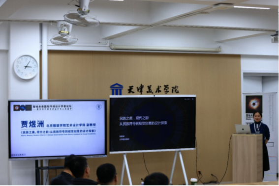 北京服装学院贾煜洲副教授在《民族之美,现代之韵:从民族符号到视觉创意的设计探索》演讲中探讨民族符号的现代化转译策略。