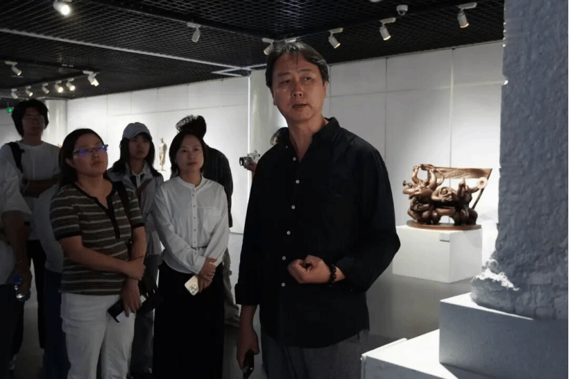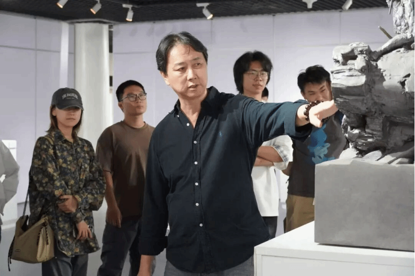 走进展厅,一件件雕塑作品以其独特的艺术语言,向观众讲述着那段波澜壮阔的历史。李迅教授逐件给大家讲解作品,从历史背景、创作理念、表现手法、材料运用以及精神传达,通过不同的材质和表现手法,塑造出一个个鲜活的人物形象和战争场景,既有浴血奋战的将士,也有顽强抗争的民众,既有硝烟弥漫的战场,也有军民鱼水情的温馨场景,体现了中国人民不怕牺牲、不屈不挠的爱国主义情怀。这次参观,师生们有一个共同的感受,这不仅是一次艺术创作和艺术修养的浸润,更是一堂深刻、生动的沉浸式思政课。